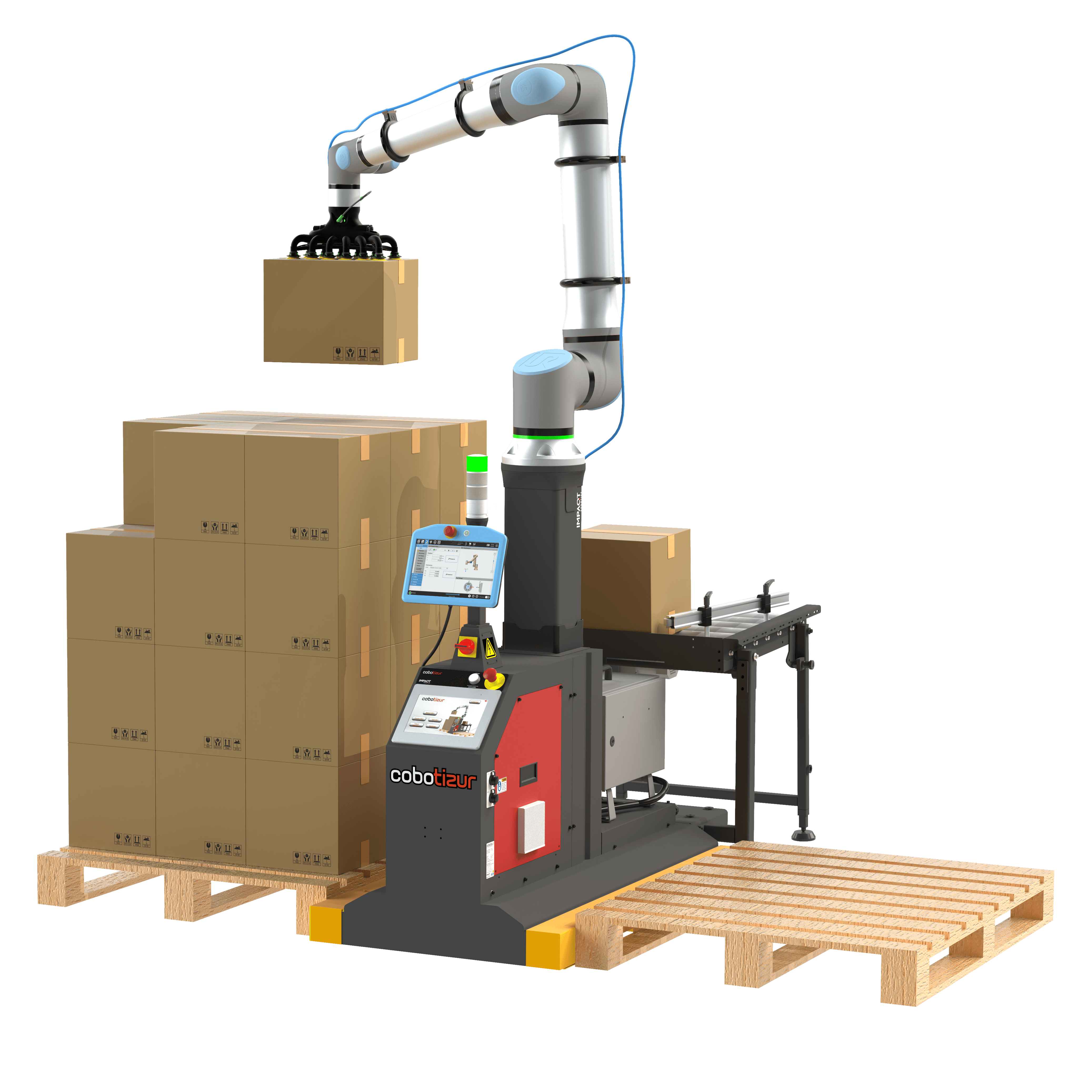Impaqt Robotics hardware with gripper, cable management, and HMI included, delivered with Impaqt palletizing software for complete solution that is ready to run from day one.